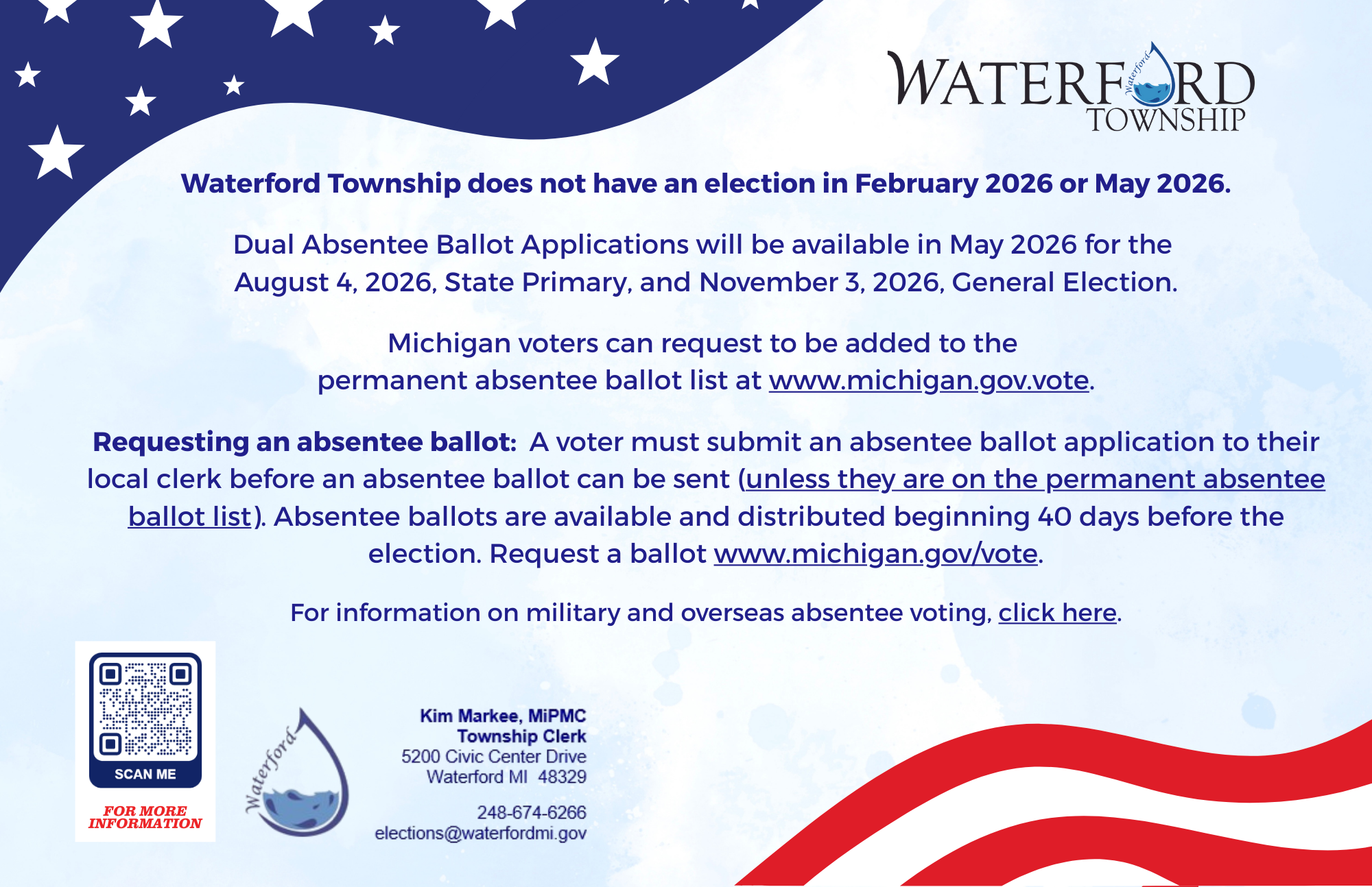 Please note that election mail will not be forwarded. If you will be away from your Michigan address, contact the Clerk's office (248-674-6266 or by e-mail) to have, an application mailed directly to you.