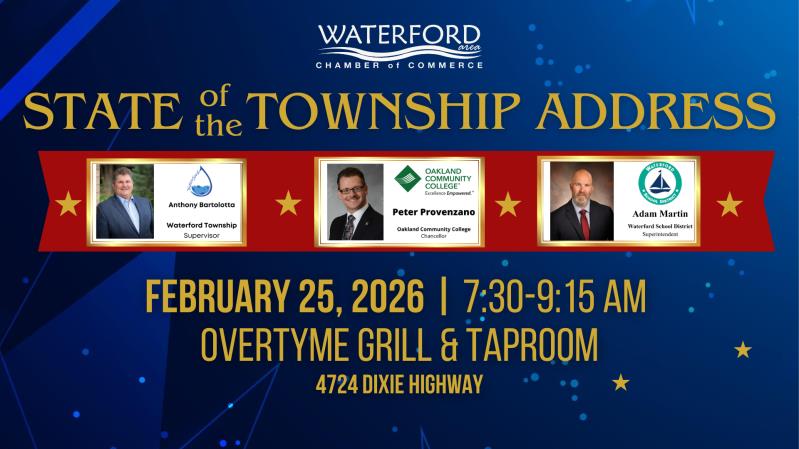 The annual State of the Township Breakfast will be held on Wednesday, February 25, 2026, at 7:30 a.m. at Overtyme Grill & Taproom, 4724 Dixie Hwy. Tickets will be available for purchase from the Waterford Area Chamber of Commerce website, www.waterfordchamber.org.