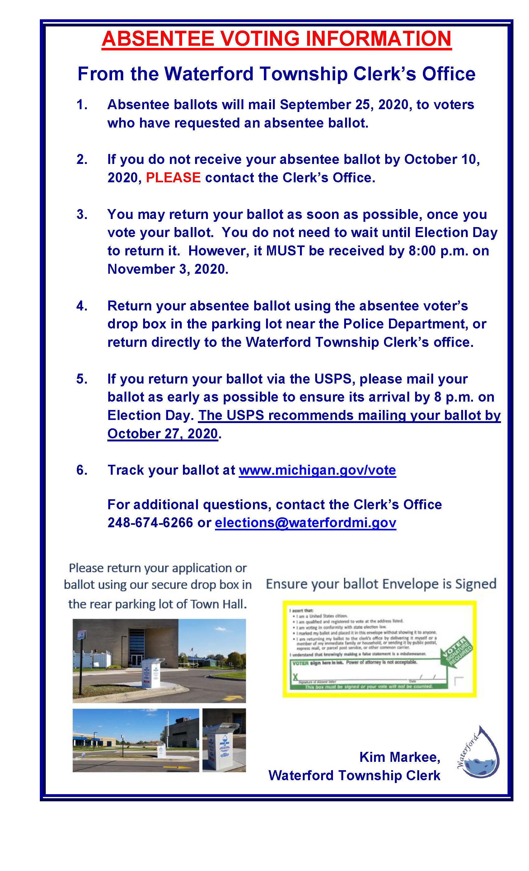 Answers to our most commonly asked questions regarding absentee voting. More information can be found at www.waterfordmi.gov/elections or feel free to call the Clerk's office directly during regular business hours at 248-674-6266.